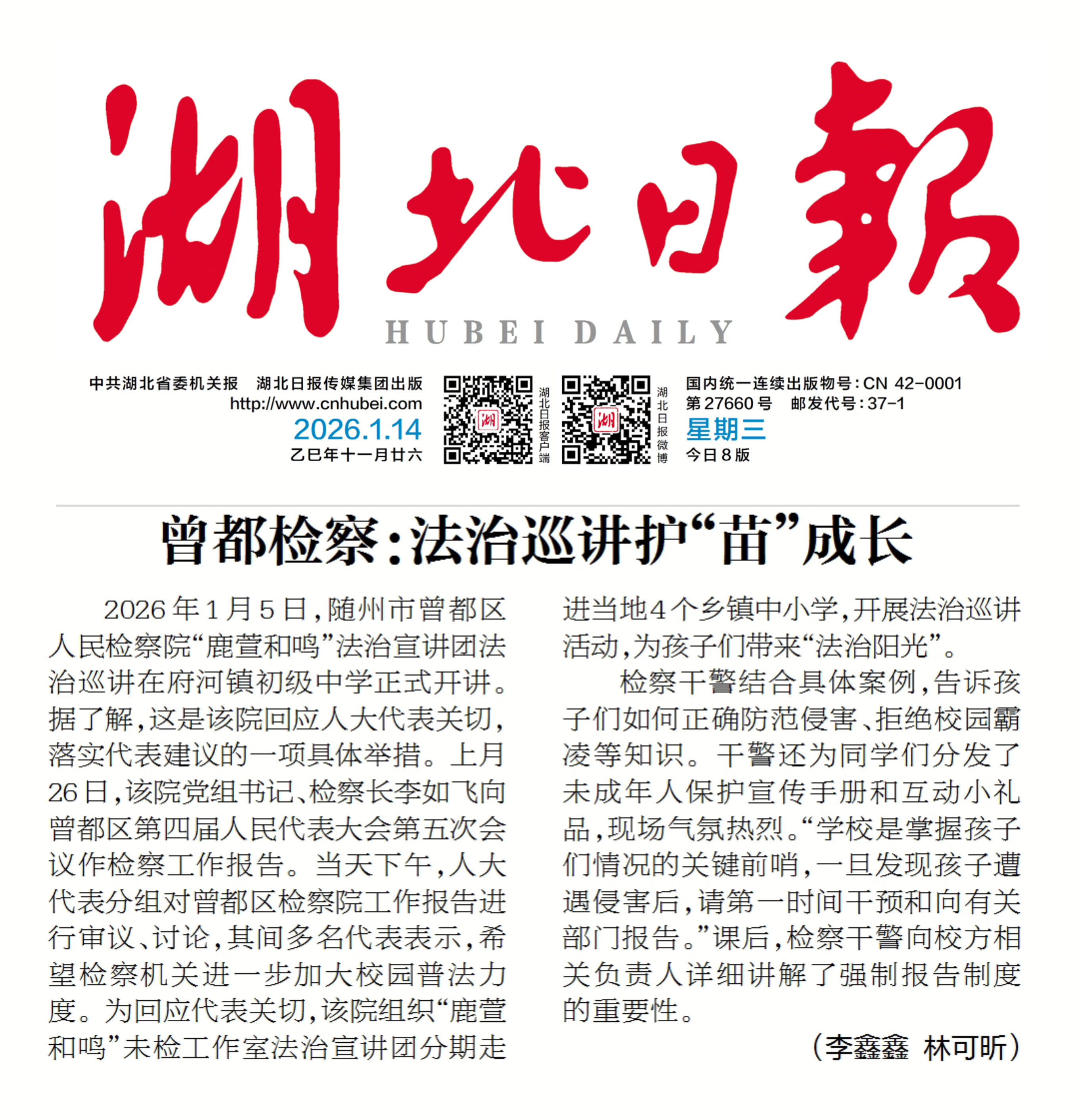 △ 2026年1月14日 《湖北日报》第A04版:时事
